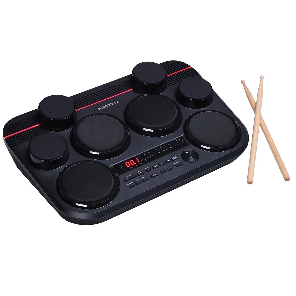 1 х 7" малый барабан, 3 х 7" том, 3 х 10" пэдов тарелок, педаль бас-барабана и Hi-Hat, 15 наборов ударных, 10 минусов, секвенсор, рекордер, метроном, USB, MIDI, цвет черный. Китай